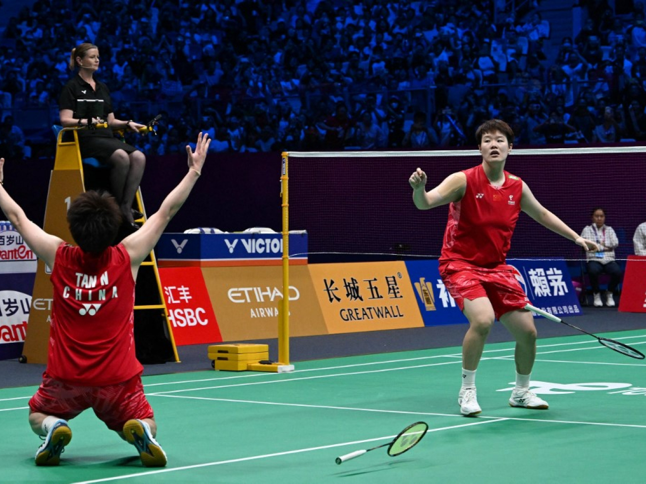 But top-ranked women’s double duo Liu Shengshu and Tan Ning had other plans, sealing the tie 3-1 with a 21-14, 21-17 victory, throwing their rackets on the ground in celebration in front of the adoring home support at the arena. (Reuters)