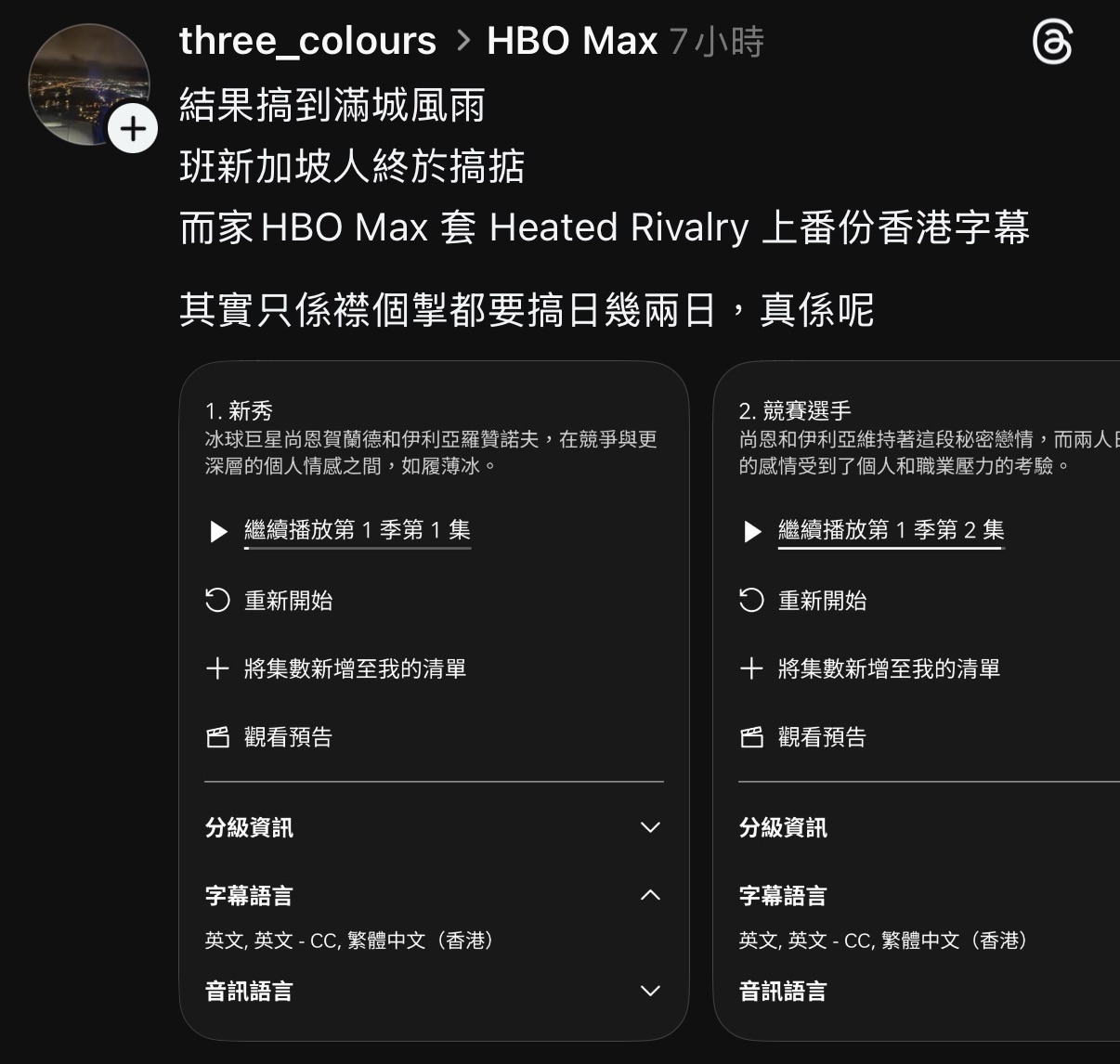 HBO Max has reinstated Traditional Chinese (Hong Kong) subtitles for the series Heated Rivalry after a wave of complaints from local viewers, following a controversy that began outside the city.